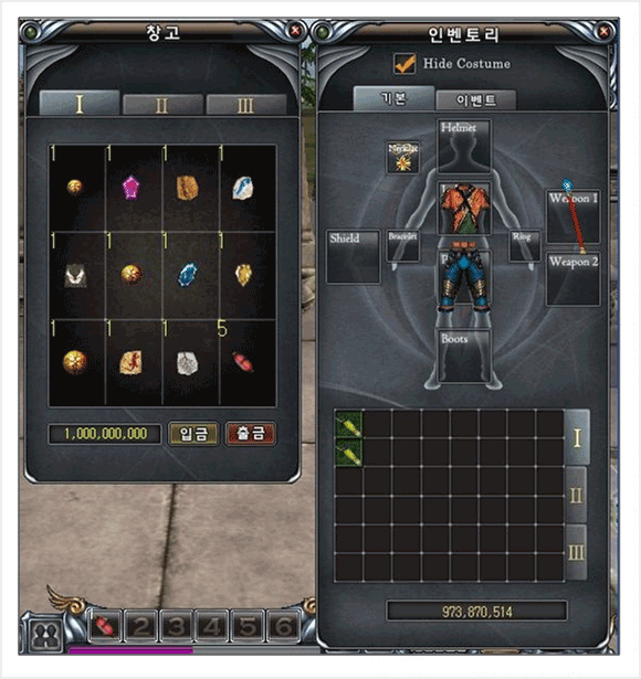 아래의 그림과 같이 창고의 I, II, III 슬롯을 이용하여 총 24가지의 아이템을 저장할 수 있으며,