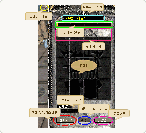 - 5. "ÆÇ¸Å½ÃÀÛ" ¹öưÀ» ´©¸£°Ô µÇ¸é »óÁ¡ÀÌ ¿¸®°Ô µÇ¸ç, ¾ÆÀÌÅÛ Ã¢¿¡ ÆÇ¸Å Áß ¸Þ½ÃÁö°¡ ¶ß°Ô µË´Ï´Ù.