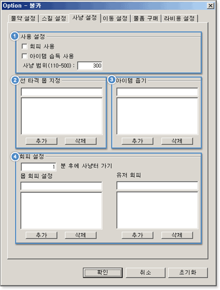 ¸ó½ºÅ͸¦ »ç³ÉÇÒ ¶§ ÀÌ¿ëµÇ´Â ¾ÆÀÌÅÛ Áݱâ, ¼±Å¸°Ý¸÷ ȸÇÇ µîÀÇ À̿뿩ºÎ¿Í ij¸¯ÅÍÀÇ È°µ¿¹üÀ§¸¦ ¼³Á¤ÇÕ´Ï´Ù.